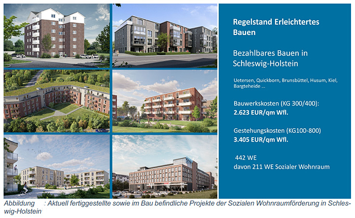 So lägen Wohnungen, die in Schleswig-Holstein zu den Bedingungen der Sozialen Wohnraumförderung aktuell gebaut würden, bei den Baukosten unter 3.500 Euro pro Quadratmeter. „Warum also um ein Drittel teurer bauen – und das auch noch fördern? Die Chance, die der Staat durch günstigeres Bauen hat, liegt auf der Hand: Es lassen sich mehr Wohnungen fördern und damit auch mehr Wohnungen bauen. Und das bei Einhaltung aller Vorschriften“, so Prof. Dietmar Walberg. Die Lösung liege im „Gebäude-Typ E“ – im einfachen, erleichterten Bauen. „Die Qualität dabei ist ausgesprochen gut – mit robuster Substanz und wenig Instandhaltung. Zu ergänzen wären die Prinzipien des modularen und seriellen Bauens. Diese Bauweisen werden noch immer zu selten berücksichtigt. Sie sind vergleichsweise preisgünstig und bei sehr guten Baustandards.