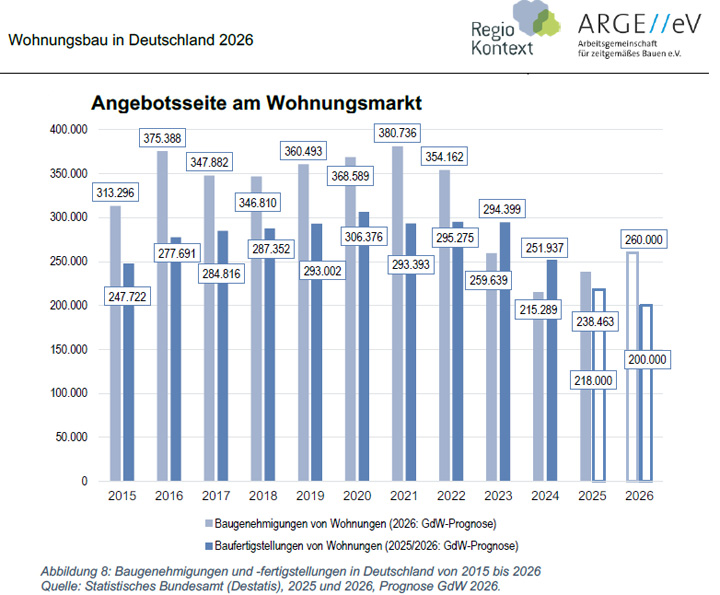 2026: ein weiterer Rückgang auf etwa 215.000 Wohnungen (oder unter 200.000)