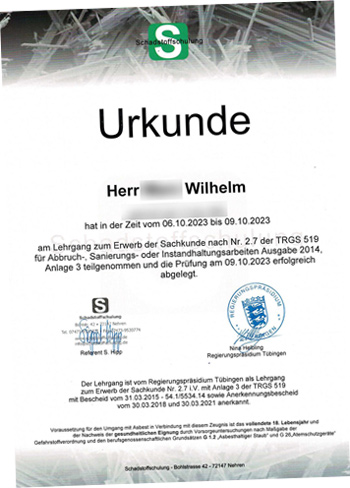 Verlängerung: Um die Gültigkeit um weitere 6 Jahre zu verlängern, muss vor Ablauf der Frist ein staatlich anerkannter Fortbildungslehrgang nach Anlage 5 der TRGS 519 absolviert werden.