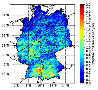 Aber es gibt regionale Trends. Besonders im Süden Deutschlands (Bayern, Baden-Württemberg, Allgäu, Schwäbische Alb) mehren sich starke Hagelereignisse seit etwa 20 Jahren. Eine statistische Erfassung gelingt nicht direkt, weil es bei so kleinräumigen Ereignissen zu wenig Meldestellen gibt. Auf der KIT-Website wird das so erläutert: „Daher werden potenzielle Hagelbahnen mit einem Tracking-Algorithmus aus den 3D-Radardaten des Deutschen Wetterdienstes (DWD) als Datengrundlage abgeleitet. Dabei werden im ersten Schritt Regionen mit hoher Reflektivität im Radarsignal gesucht und anschließend zu Hagelbahnen zusammengefasst.